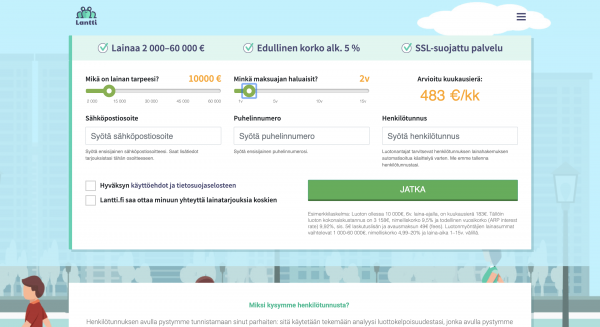 | Mistä voin saada lainatarjouksia? | Meidän kautta hakemuksesi lähtee yli 20 pankille ja rahoitusyhtiölle. Saat tiedon hyväksytyistä lainatarjouksista suoraan hakemusprosessin yhteydessä sekä sähköpostiisi. Kaikki hakemukset kilpailuttaa ja lainat välittää Lantin yhteistyökumppani Salus Group Oy. Laina nostetaan aina Salus Group Oy:n oma.rahoitu-palvelussa johon sinut ohjataan automaattisesti, jos hakemuksesi on hyväksytty ja saat lainatarjouksia. |